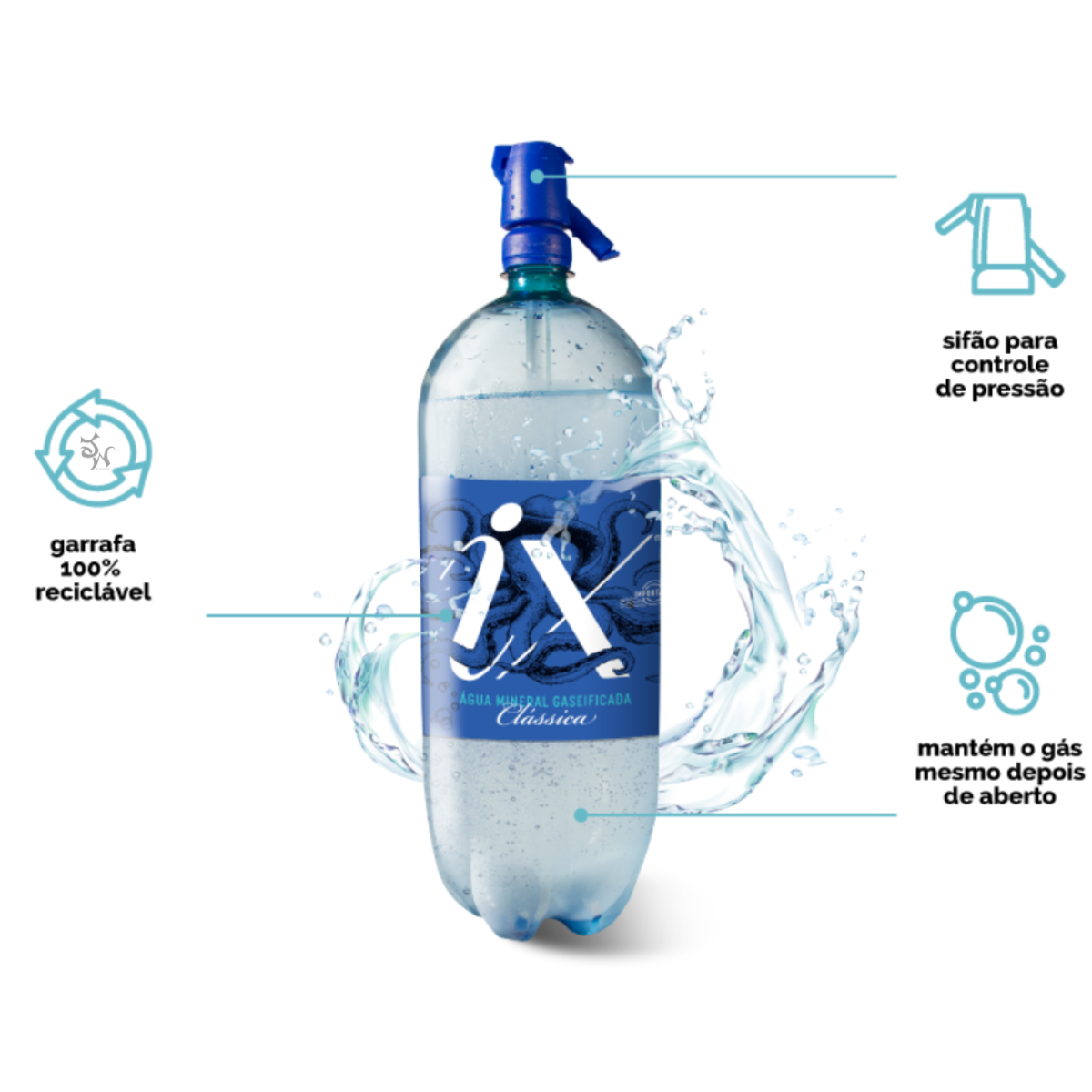 A iX Soda é uma água mineral importada da Argentina que segue o padrão IVESS, um indicador argentino que garante um produto com pureza e qualidade diferenciados. Esta água com gás é benéfica para a saúde, pois além de hidratar, contém os mesmos micronutrientes que a água natural. O CO² (gás carbônico) presente é eliminado do corpo logo após a ingestão, pois é um gás inerte, conferindo apenas as bolhas à água e um sabor mais ácido. Cada embalagem contém 1,75 litros de água gaseificada e um sifão para controle de pressão. Isso permite manter o gás no produto por muito mais tempo após a abertura. Além disso, a embalagem é descartável, eliminando a necessidade de armazenar embalagens vazias. Durante o processo de envase, a iX Soda passa por vários processos de filtragem, ajuste da quantidade de minerais e ozonização para garantir a ausência de bactérias e outros elementos que possam interferir no sabor. Experimente a iX Soda para uma experiência diferenciada!